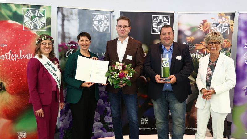 Den Preis für das Konzept „baumerbe – ein Grab am Zukunftsbaum“ der Treuhandstelle für Dauergrabpflege Niedersachsen/Sachsen-Anhalt GmbH nahmen Uwe Stapelmann und André Burmester in Empfang. (v.l.) Die Deutsche Blumenfee 2023/24 Kathrin Köhler, Staatssekretärin Silvia Bender vom Bundeslandwirtschaftsministerium, Uwe Stapelmann und André Burmester, ZVG-Präsidentin Eva Kähler-Theuerkauf. Bild: ZVG/Rafalzyk.
