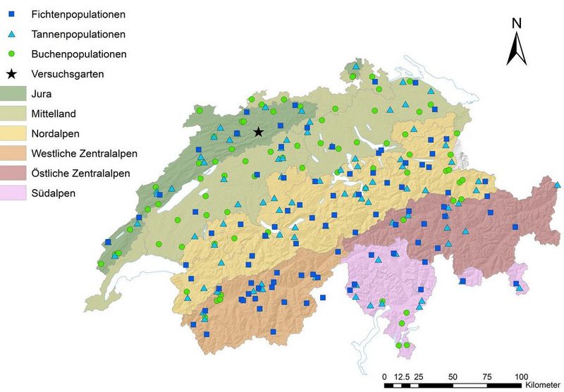 Verteilung der untersuchten 92 Fichten- (Picea abies), 90 Tannen- (Abies alba) und 77 Buchenpopulationen (Fagus sylvatica) in der Schweiz. Der Stern weist auf den Pflanzgarten bei Matzendorf (Kt. Solothurn) hin. Die sechs biogeografischen Regionen sind mit unterschiedlichen Farben markiert. (Gonseth et al., 2001). Grafik: WSL