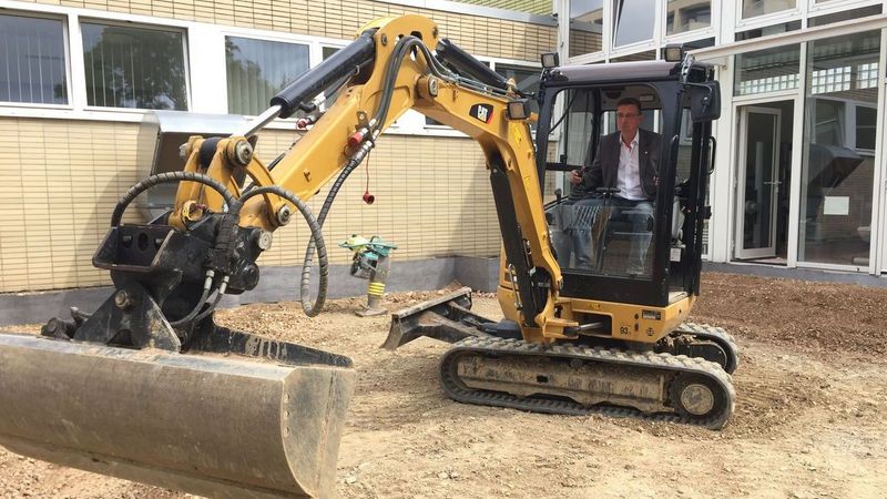 Bei der Besichtigung einer Baustelle in der Montanus-Klinik der Deutschen Rentenversicherung in Bad Schwalbach legte Martin Rabanus selbst mit Hand an. Unter fachkundiger Anleitung bediente Martin Rabanus den Bagger, um die Fläche für ein geplantes Holzdeck freizulegen. Das Holzdeck soll in Zukunft als zusätzlicher Therapieort im Sommer genutzt werden, so dass Patienten die Möglichkeit haben, ihre Reha-Übungen draußen durchzuführen. „Traumhafte Lage und frische Luft haben erhebliche Wirkung auf den Therapieerfolg" sagt York Ohlendorf, Kaufmännischer Leiter der Montanus-Klinik, der das Bauvorhaben leitet.