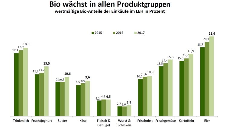 Im österreichischen Lebensmitteleinzelhandel (LEH) wurden im Jahr 2017 biologische Lebensmittel (ohne Brot und Gebäck) im Wert von 508 Mio. Euro gekauft. Jeder Österreicher kauft mindestens einmal im Jahr ein biologisches Lebensmittel, die Käuferreichweite liegt laut RollAMA-Zahlen bei 96,2%. Sowohl die Einkaufshäufigkeit als auch die eingekaufte Menge an Bio-Produkten stiegen in den letzten Jahren kontinuierlich an.