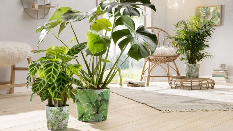 Die großflächigen Blattdekore wirken wie echt, sind beruhigende Eyecatcher im stressigen Alltag und passen perfekt zu Zebramarante (Calathea zebrina), Fensterblatt (Monstera deliciosa) oder Bergpalme (Chamaedorea elegans).