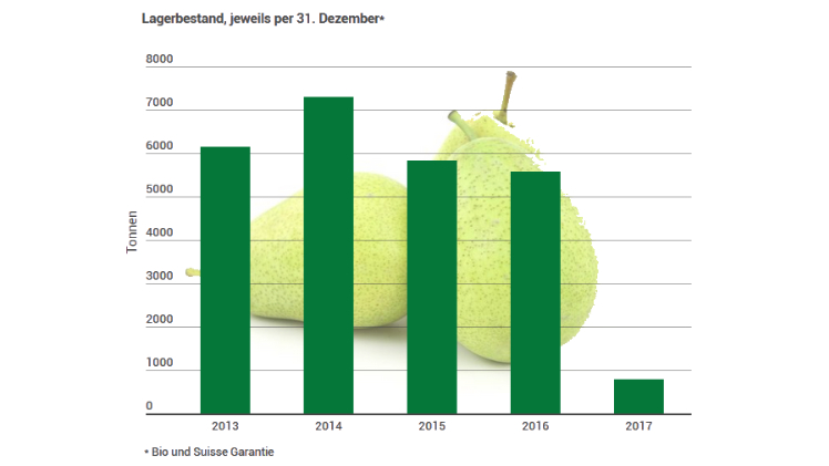 Ende Dezember 2017 waren in der Schweiz fast 90% weniger Birnen auf Lager als im Schnitt der letzten 4 Jahre. Grund für den tiefen Bestand sind die Frostnächte im April, welche sich negativ auf die Erträge ausgewirkt haben. Den Hauptanteil des Lagerbestandes macht die Sorte Kaiser Alexander aus, gefolgt von Gute Luise und Conférence. (Quelle: SOV/Swisscofel/Bio Suisse)