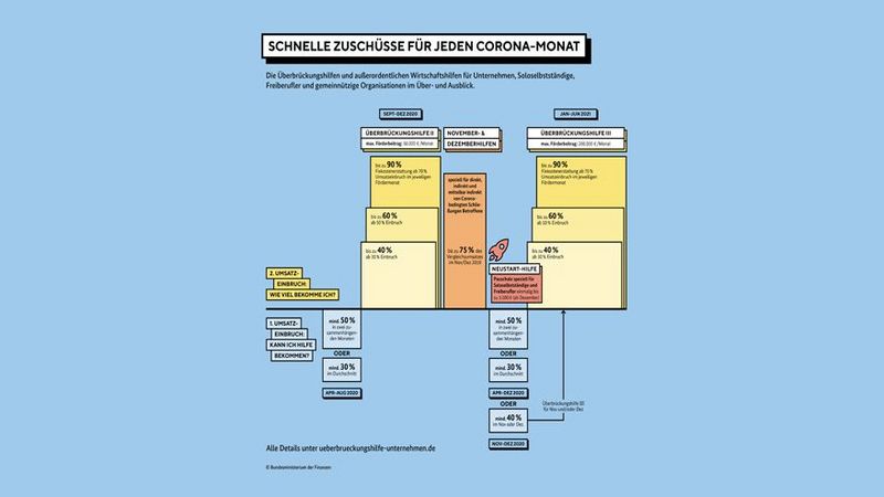 Da in vielen Wirtschaftszweigen die Geschäftstätigkeit weiterhin nur eingeschränkt möglich sein wird, haben sich Bundesfinanzminister Olaf Scholz und Bundeswirtschaftsminister Peter Altmaier außerdem darauf verständigt, die bisherige Überbrückungshilfe bis Ende Juni 2021 zu verlängern und noch einmal deutlich auszuweiten. Die Überbrückungshilfe unterstützt Unternehmen, die von den Maßnahmen zur Pandemie-Bekämpfung besonders stark betroffen sind. Es handelt sich um direkte Zuschüsse, die nicht zurückgezahlt werden müssen.