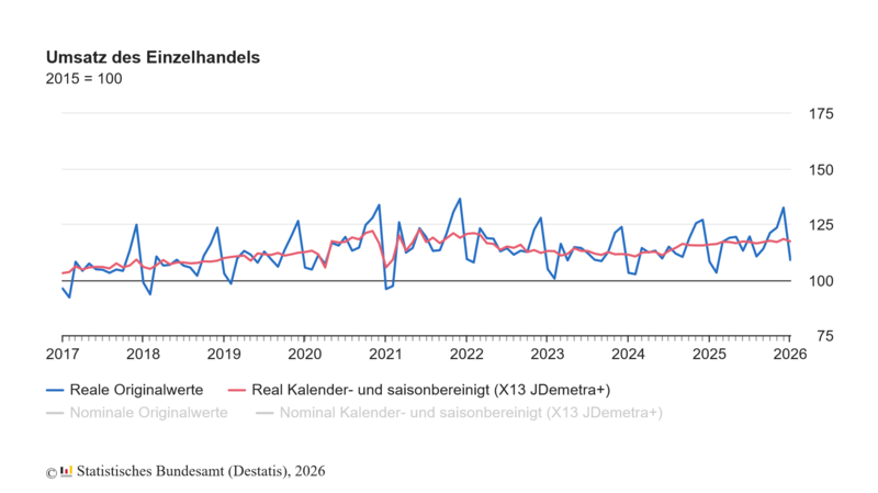 Nominal (nicht preisbereinigt) blieb der Umsatz im Januar 2026 unverändert auf dem Niveau des Vormonats. Im Vergleich zum Vorjahresmonat Januar 2025 stieg der Umsatz real um 1,2% und nominal um 2,5%. Im Dezember 2025 verzeichnete der Einzelhandelsumsatz gegenüber November 2025 nach Revision der vorläufigen Ergebnisse einen Anstieg von real 1,2% (vorläufiger Wert: +0,1%) und nominal 1,1% (vorläufiger Wert: -0,1%).