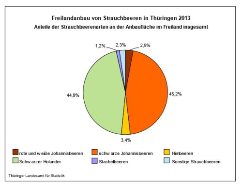Im vergangenen Jahr erzeugten 20 Thüringer Landwirtschaftsbetriebe auf einer Fläche von 139 Hektar 581 Tonnen Strauchbeeren. Dabei ging der Anbau gegenüber 2012 um rund 48 Hektar bzw. um ein Viertel des Anbaus zurück. Die Erhöhung der Ernte menge um 135 Tonnen ist darauf zurück zu führen, dass einige Flächen die Ertragsfähigkeit erreichten.