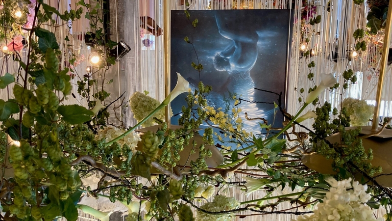 Die 26 mystischen, spirituellen Naturbilder vom Isnyer Künstler Friedrich Hechelmann – die übrigens auch gekauft werden können – sind die perfekte Ergänzung zu Kunstwerken mit den Namen „Über den Wolken“, „Magie der Worte“ oder „Ruhekissen“. Sie mussten teilweise vergrößert werden, damit sie in die Halle zu den floralen Kunstwerken passen und nicht untergehen.